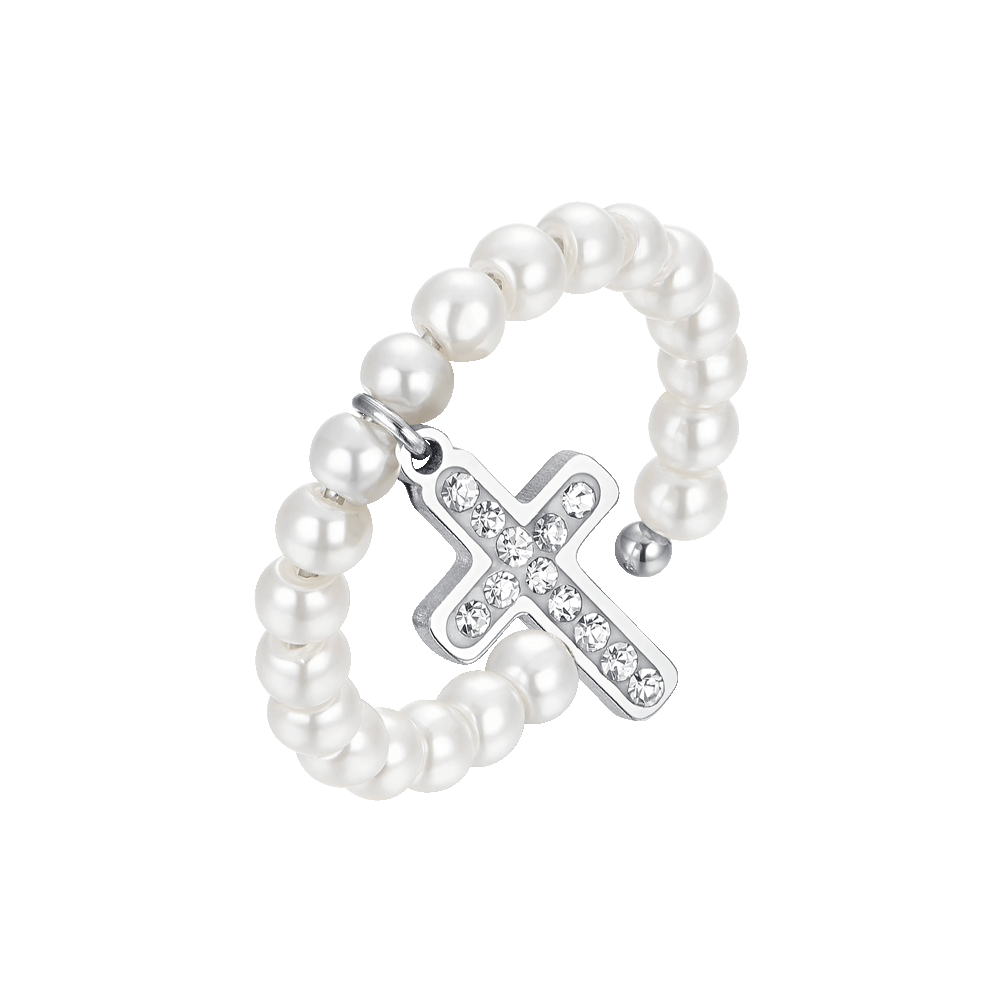 Anello Donna in acciaio regolabile con perle sintetiche e croce con cristalli bianchi. Misura perla: 3 mm. Misura croce: 8 x 13 mm. Misura regolabile.