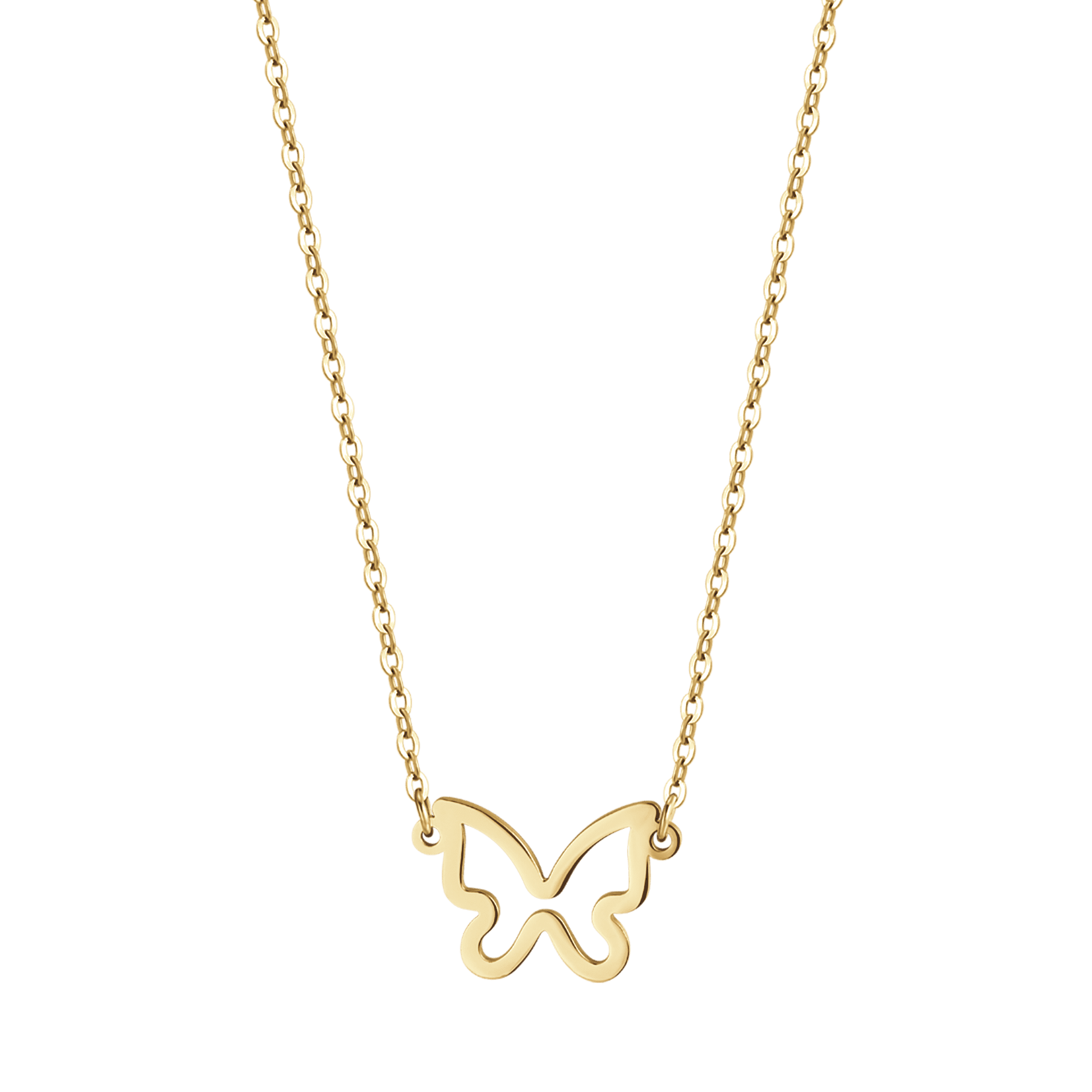 Collana in acciaio dorato con farfalla. Lunghezza: 40 + 5 cm.